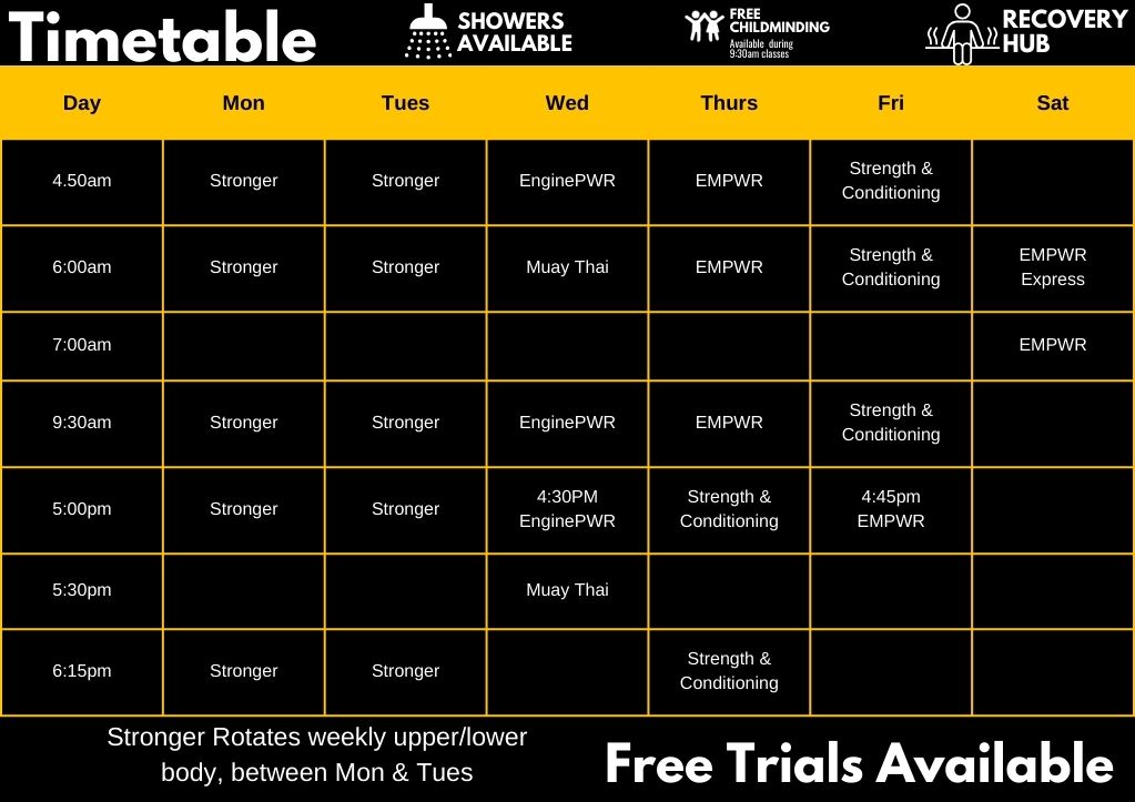 EMPWR is a WOD-style group training class that blends conditioning and strength into one session. Classes generally involve a conditioning piece followed by a barbell complex, designed to build muscle strength, increase endurance, and improve cardiovascular fitness. Every workout is coached and scalable, making it suitable for all experience levels while still driving real progression.